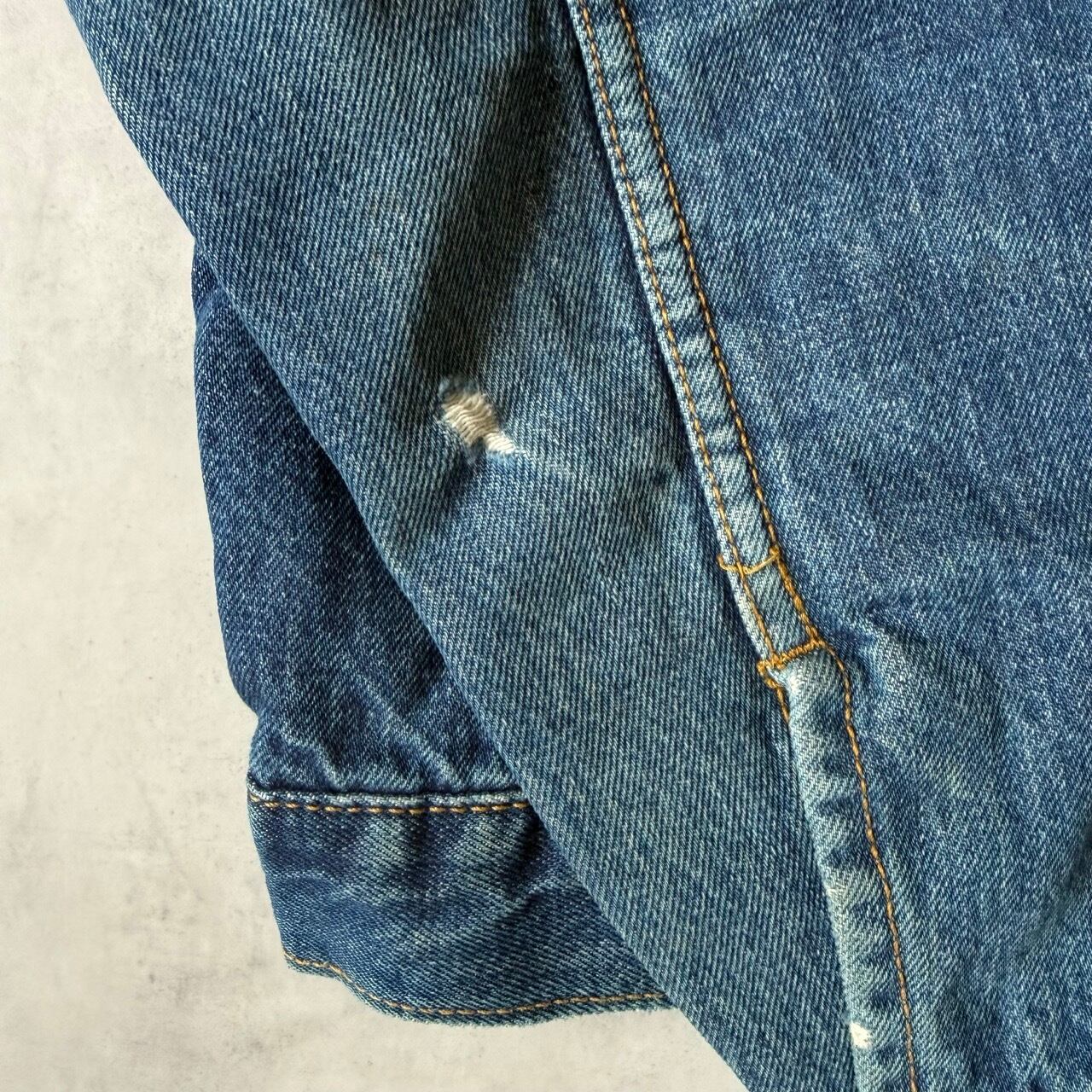 ・左袖先にダメージ(破れ)が見受けられますが、ヴィンテージ古着特有の味としてお楽しみいただける範囲です。その他、全体的に適度な色落ちや使用感はありますが、大きな汚れはなく、まだまだ着用いただけるコンディションです。