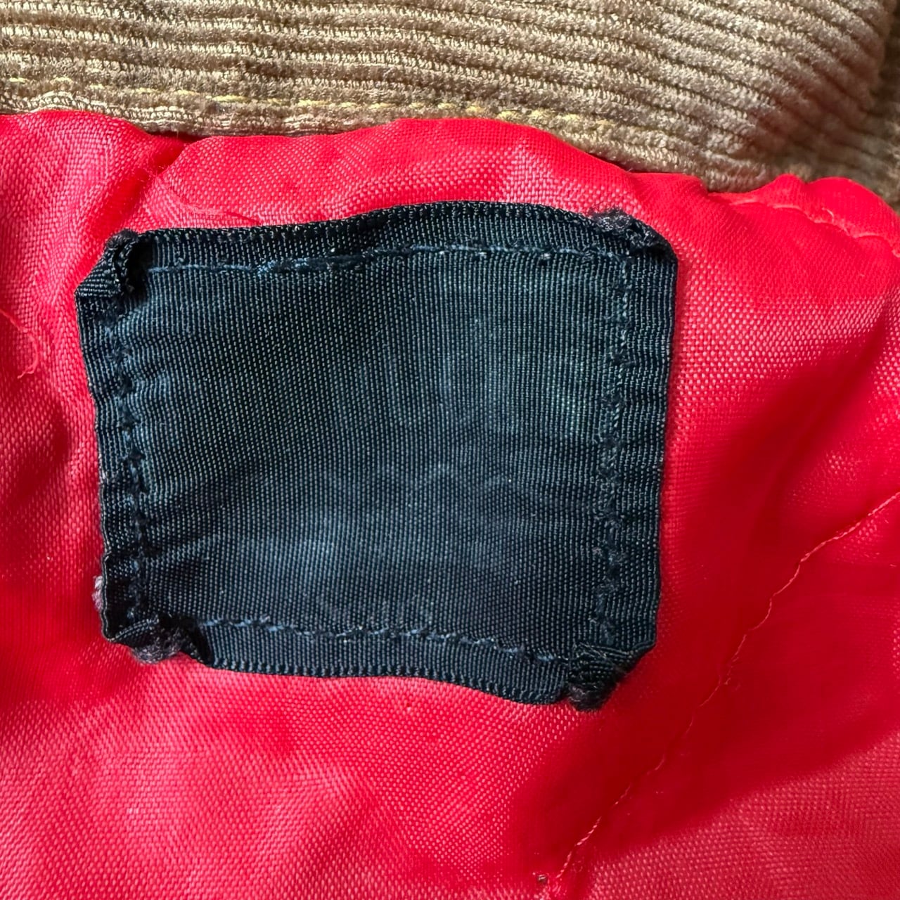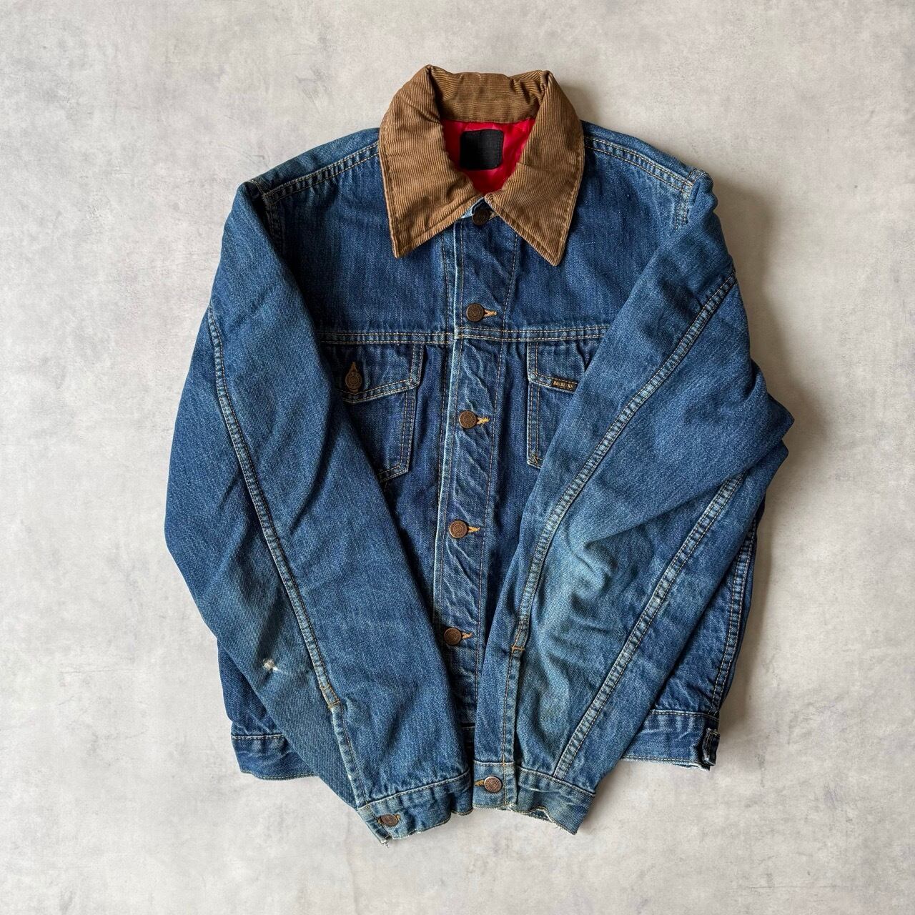 襟がコーデュロイに切り替えられており、裏地には保温性の高いレッドカラーのブランケット(キルティング)が施された、冬場でも着用可能な一着です。