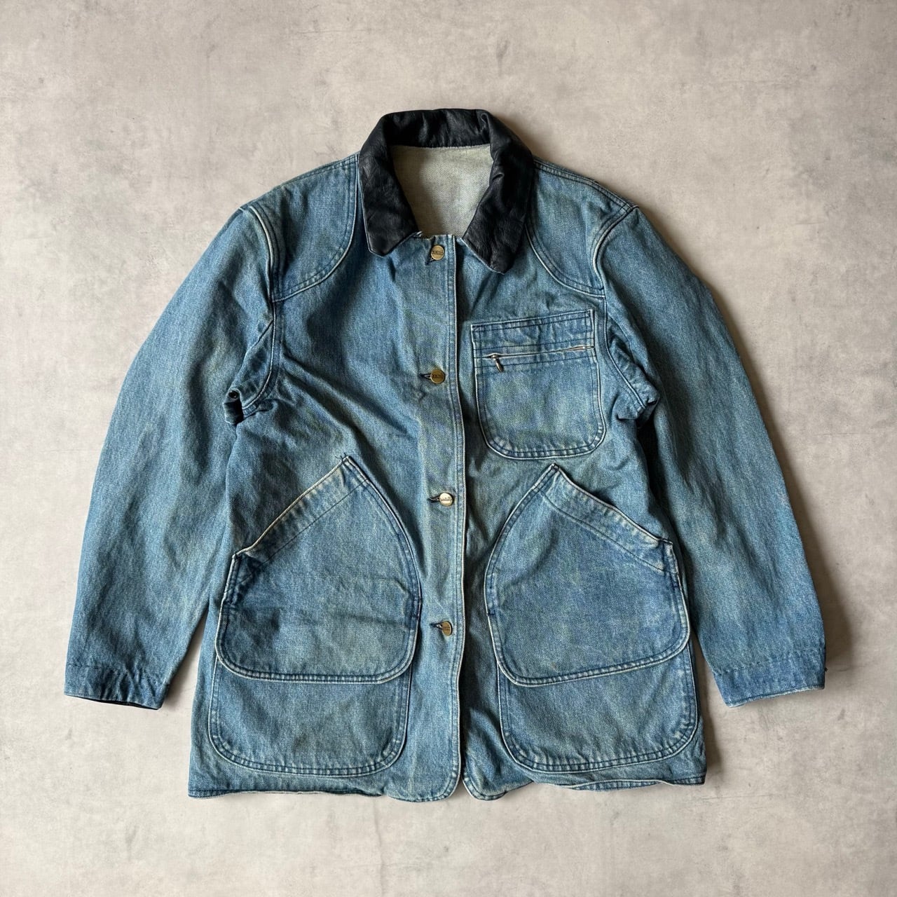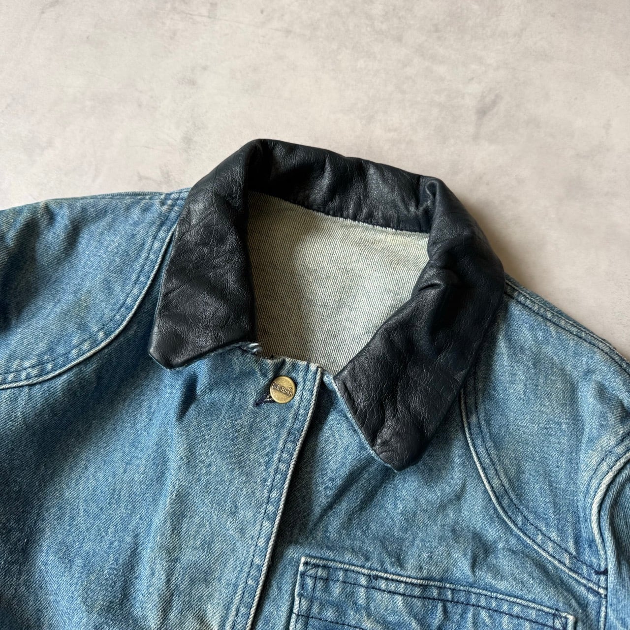 表地は風合いの良いデニム生地、襟には高級感のあるレザー(本革)が使用されています。