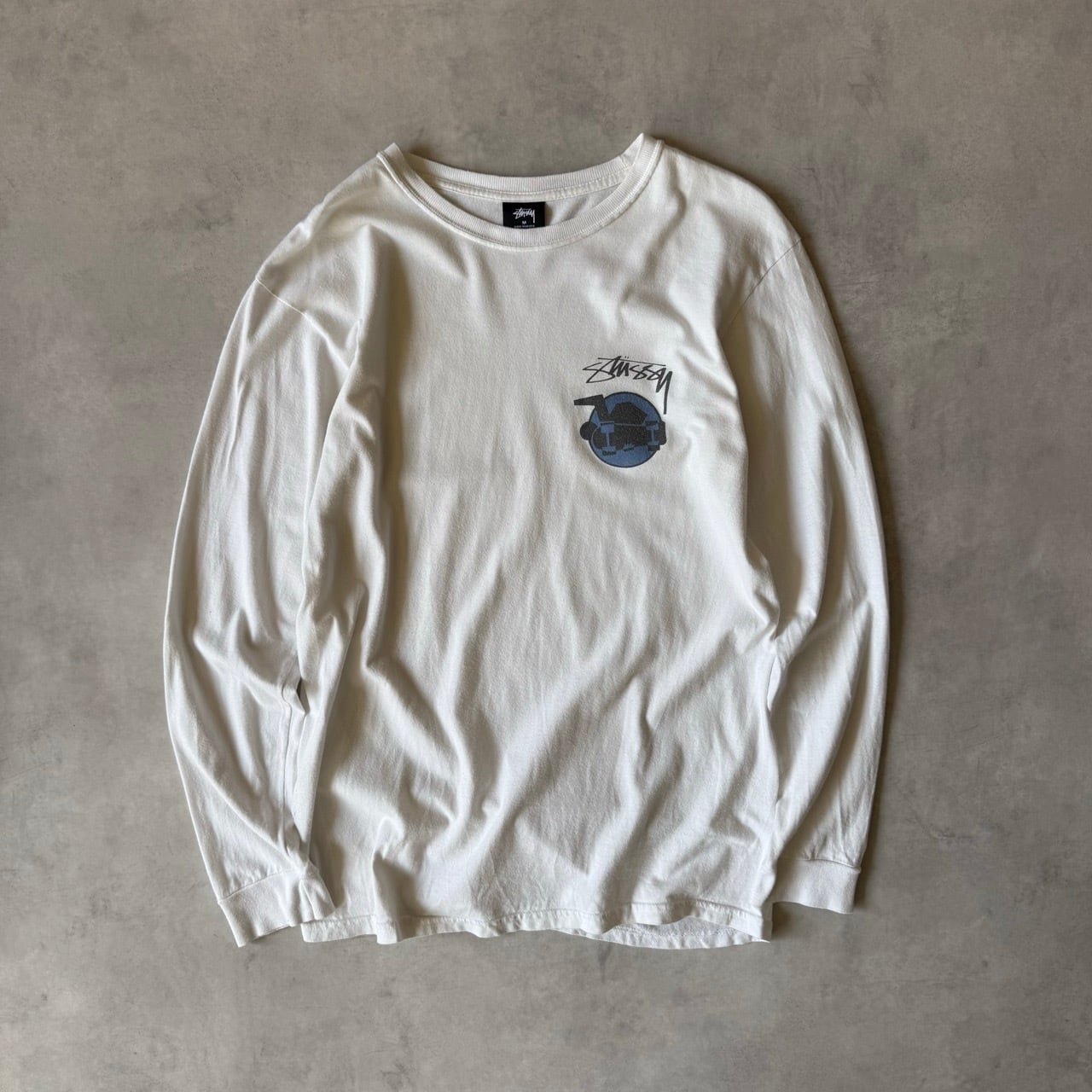 ・左胸にステューシーのストックロゴと、円の中にスケートボードが描かれたグラフィックがプリントされた一着です。