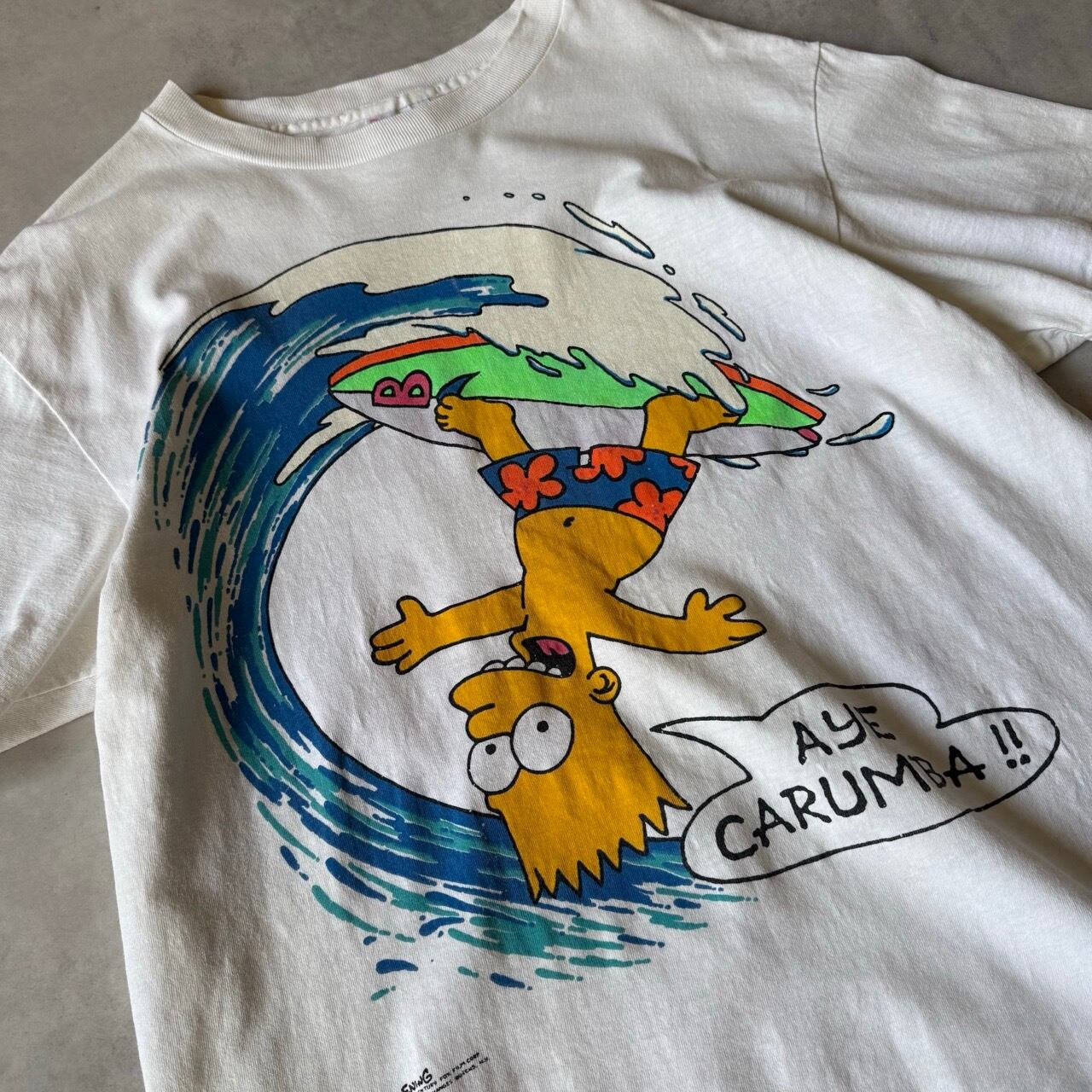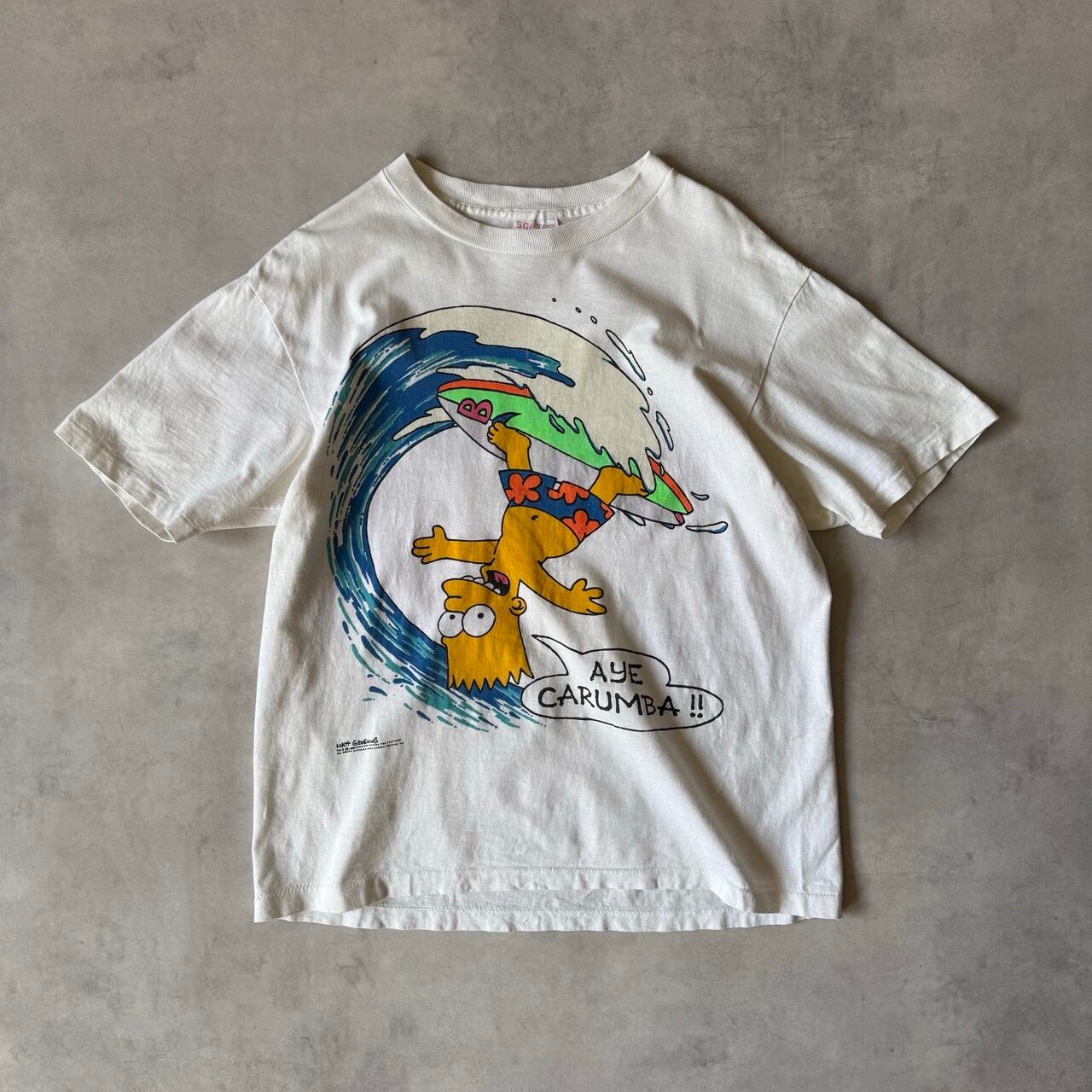 フロントにはバート・シンプソンがサーフィンをしているキャッチーなグラフィックと、お馴染みのセリフ「AYE CARUMBA!!」がプリントされています。