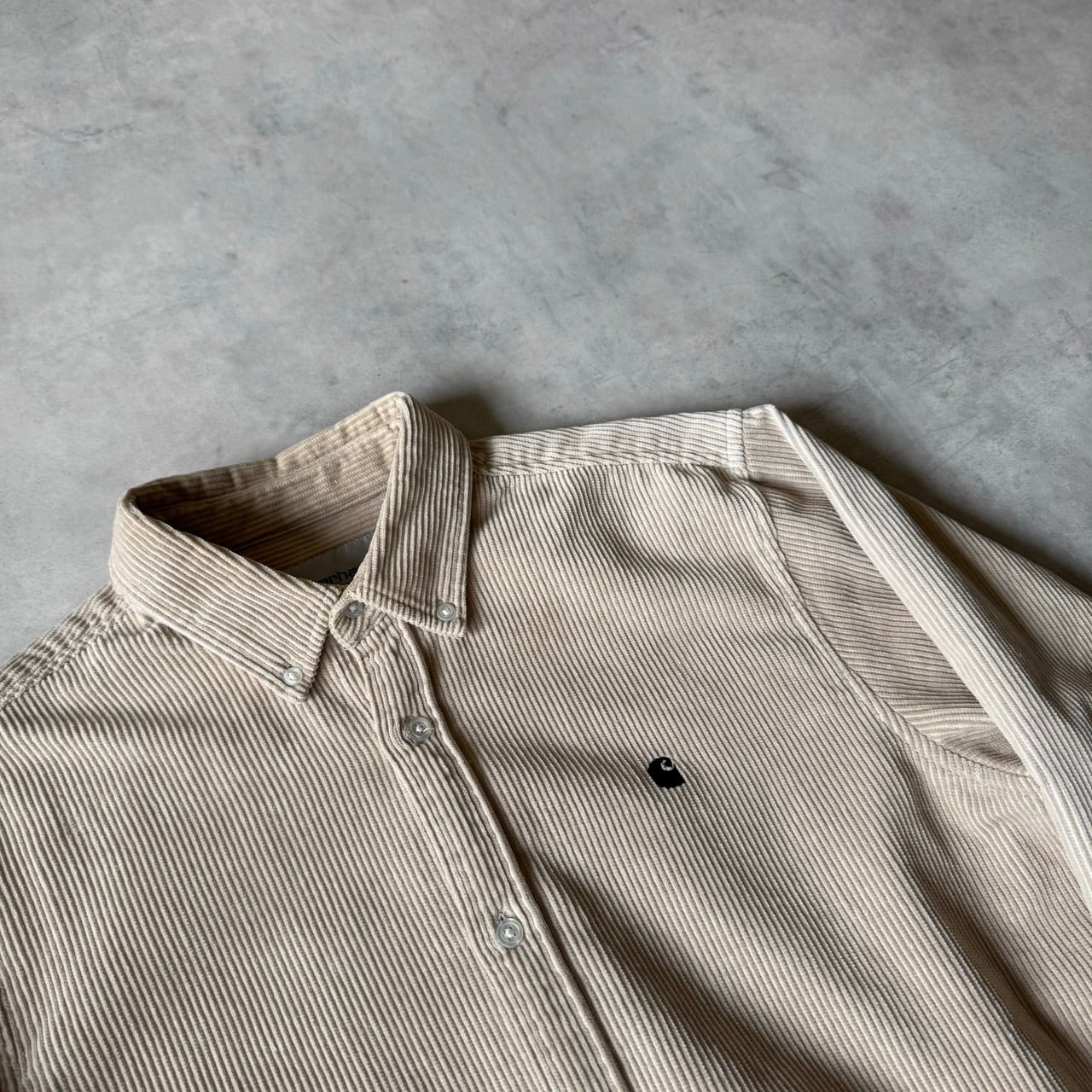 ・細畝のコーデュロイ生地を使用した、上品さとワークテイストを兼ね備えた一着です。胸元にはブランドロゴの刺繍入り。ボタンダウン仕様で幅広いスタイリングにマッチします。