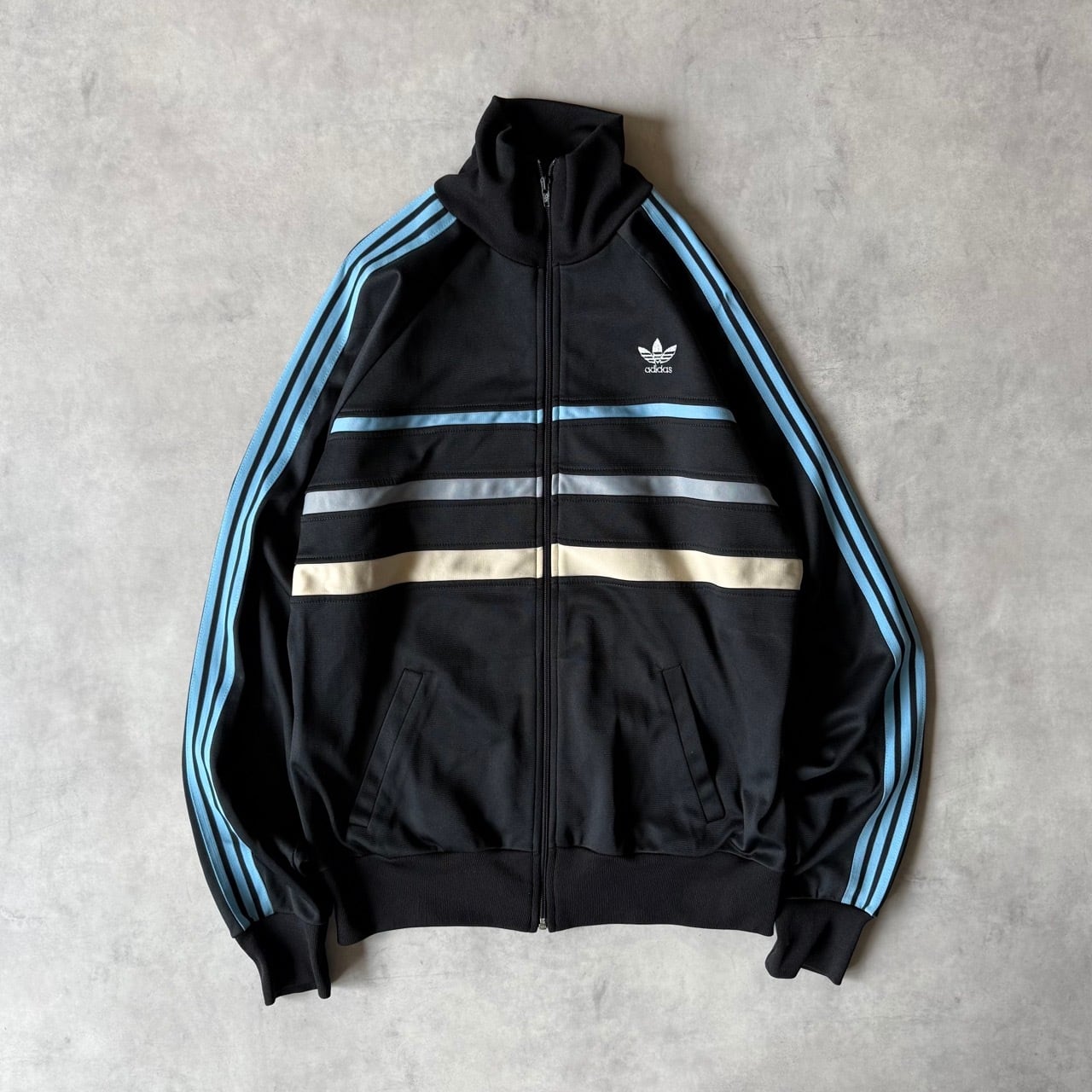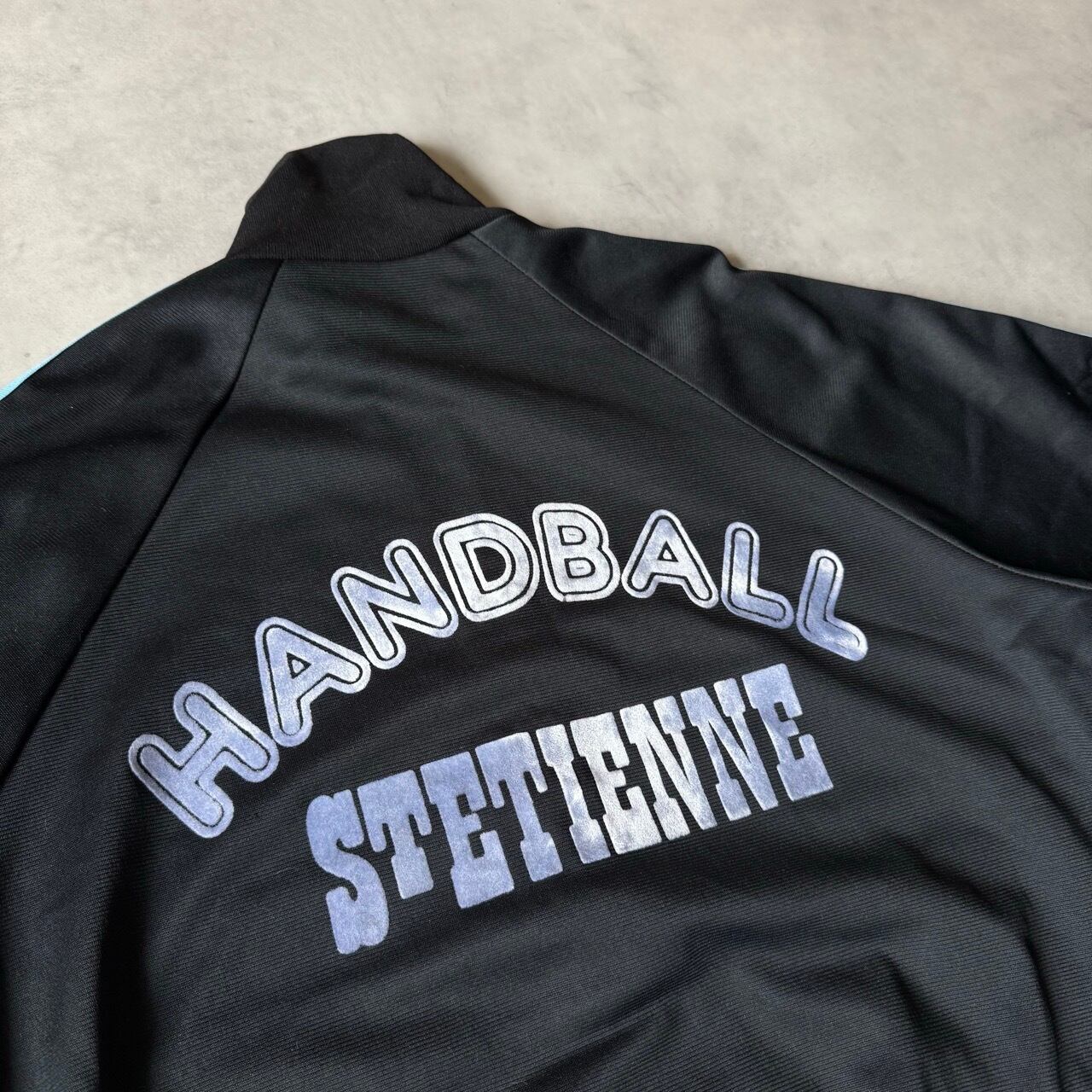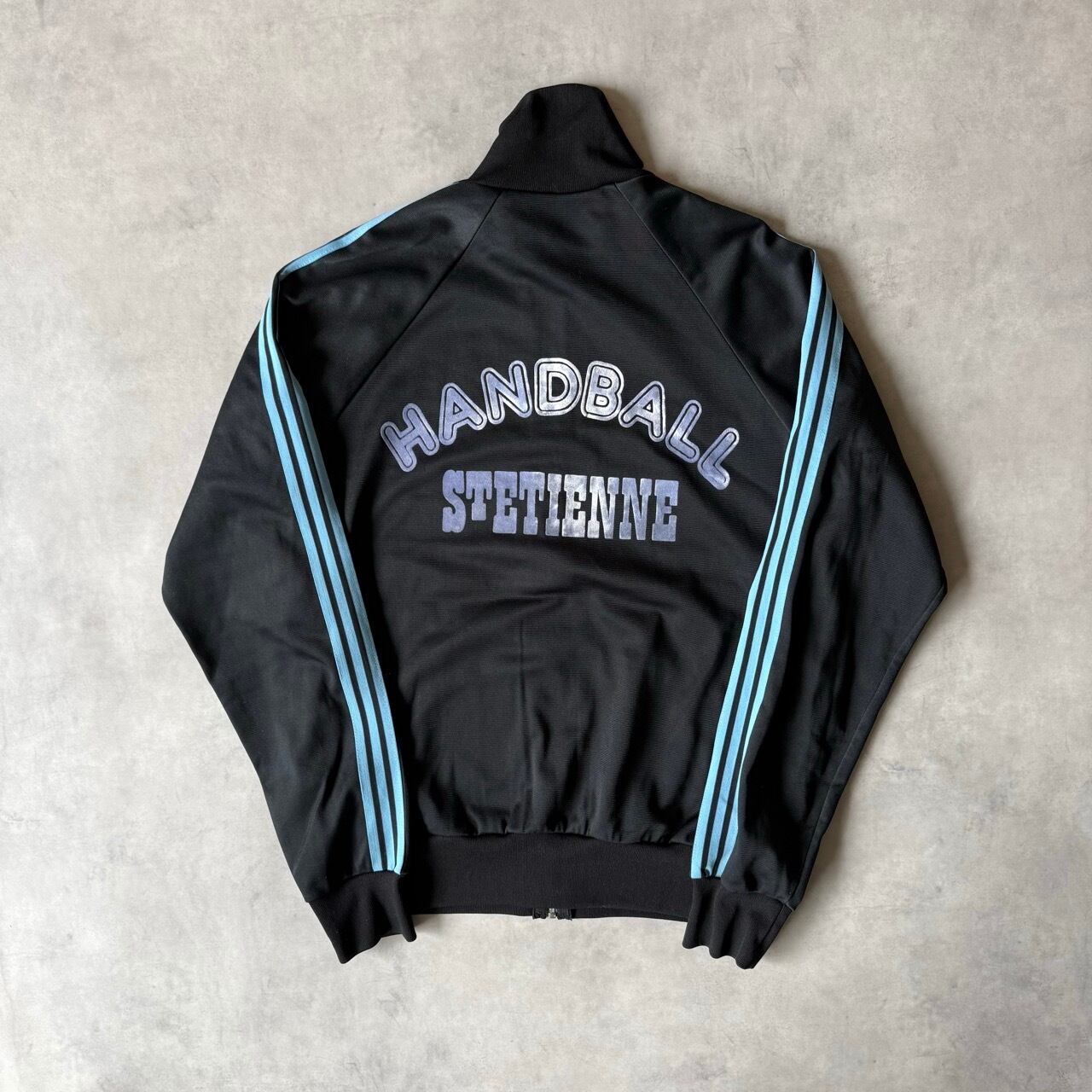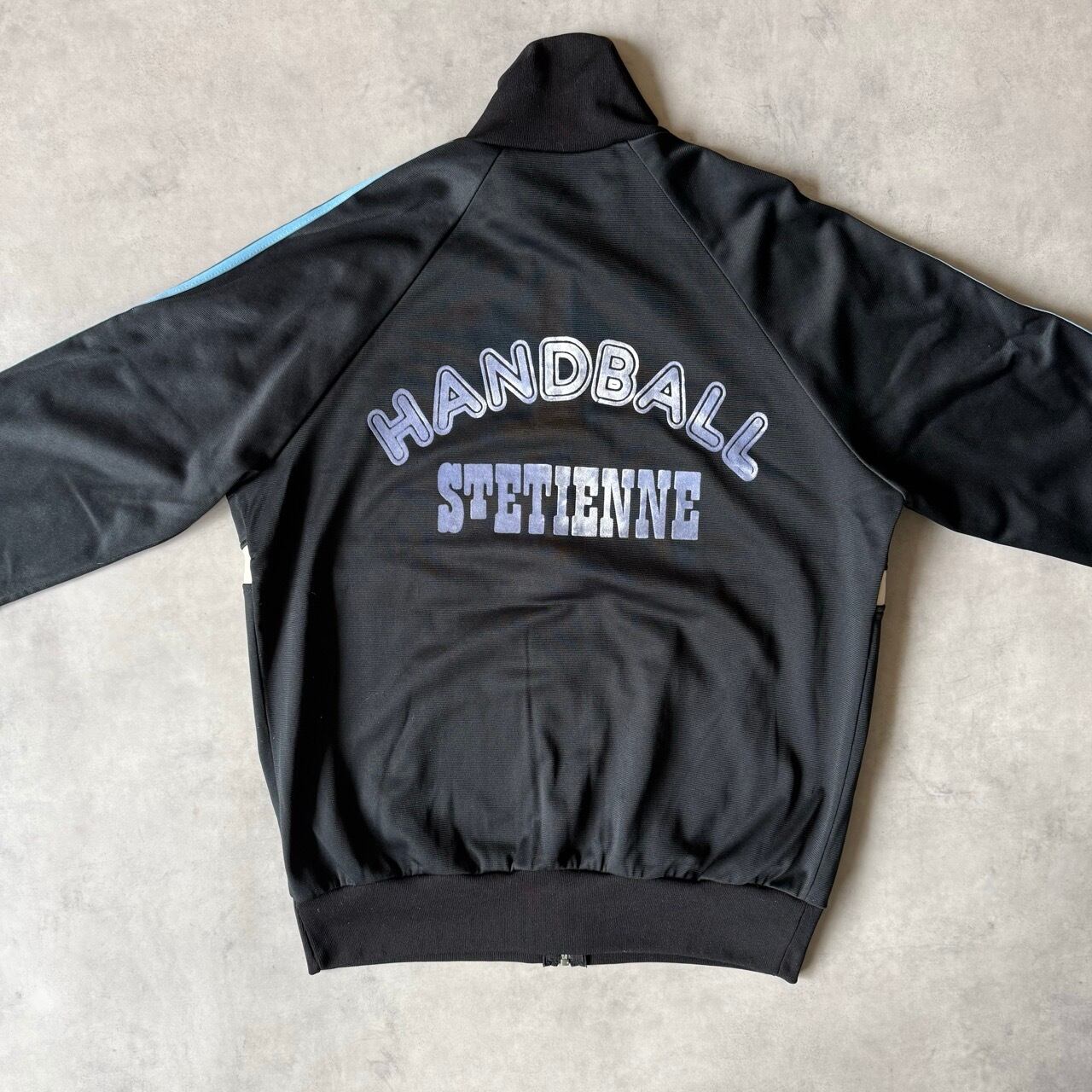 70年代〜80年代頃の希少なフランス製(VENTEX社製)。黒ボディにサックスブルーの3本ラインが映える、ヴィンテージファン垂涎の1着です。胸元にはトレフォイルロゴの刺繍入り。