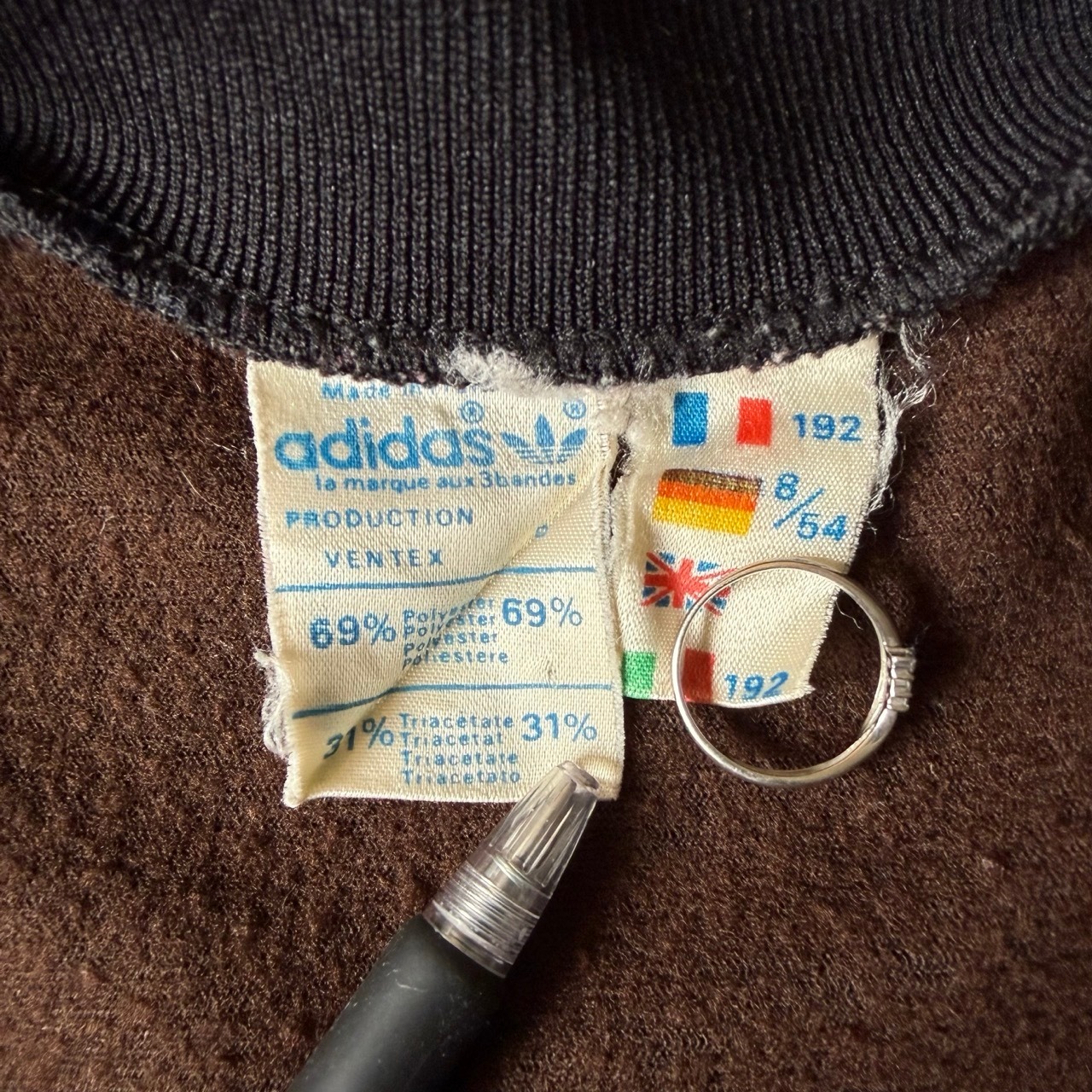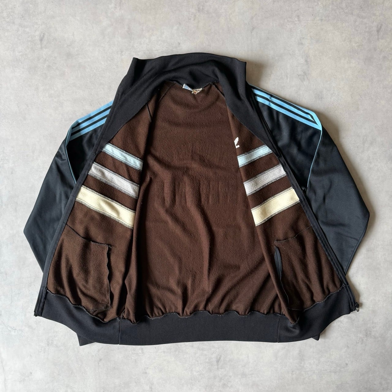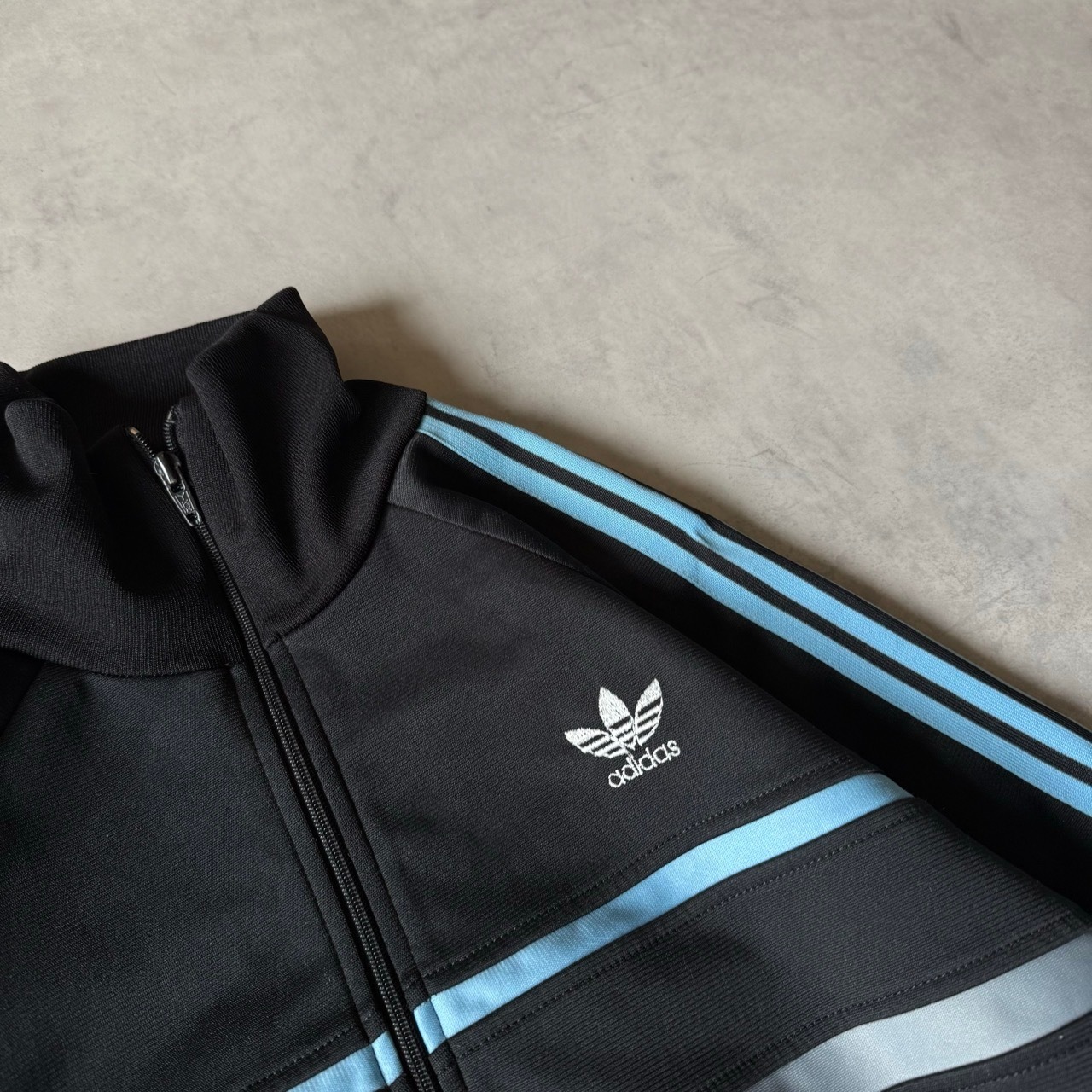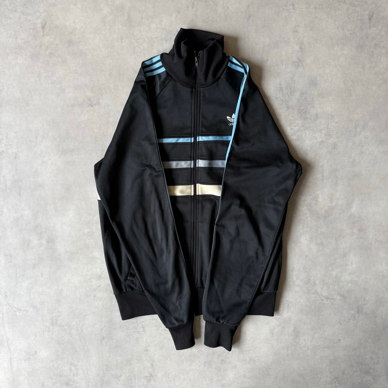 70年代〜80年代頃の希少なフランス製(VENTEX社製)。黒ボディにサックスブルーの3本ラインが映える、ヴィンテージファン垂涎の1着です。胸元にはトレフォイルロゴの刺繍入り。