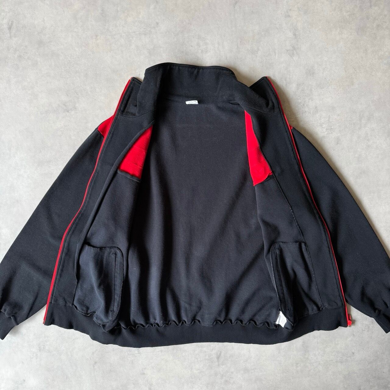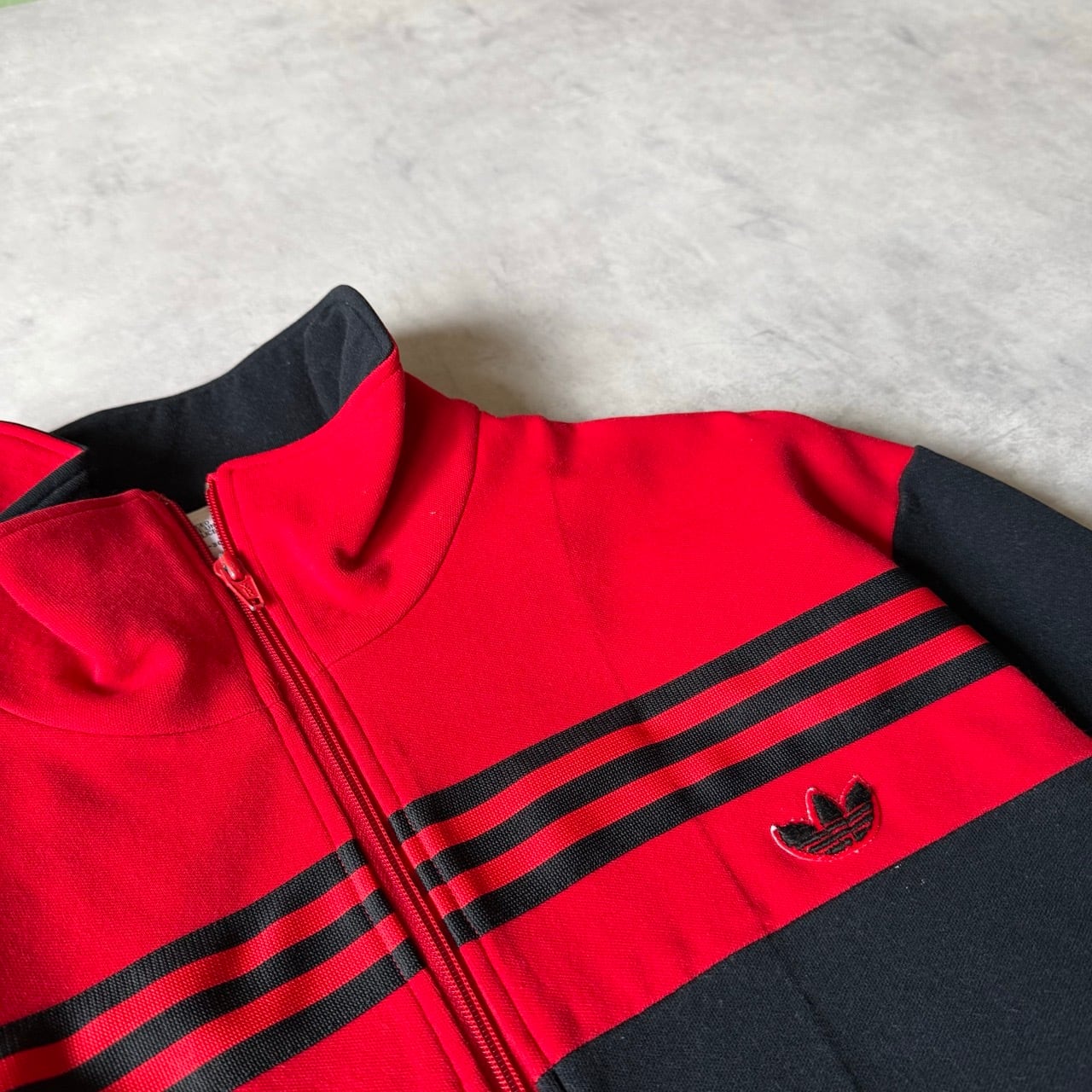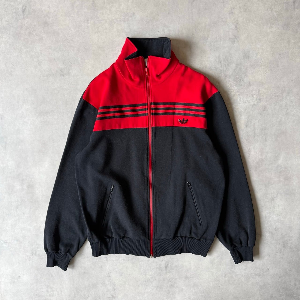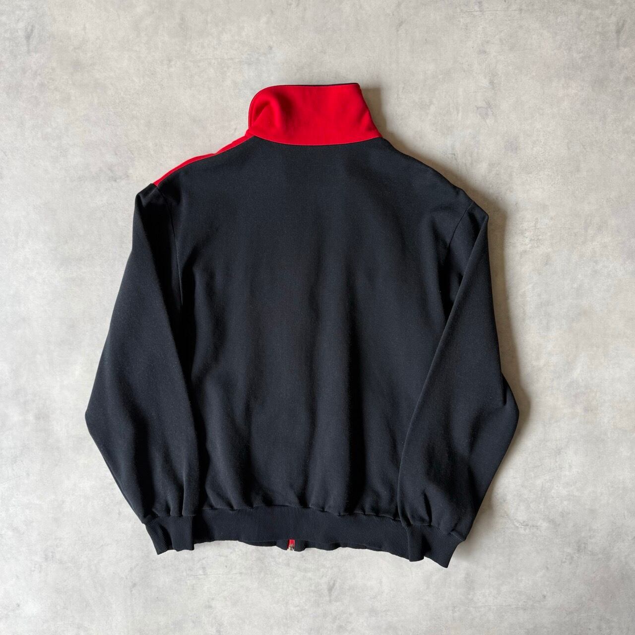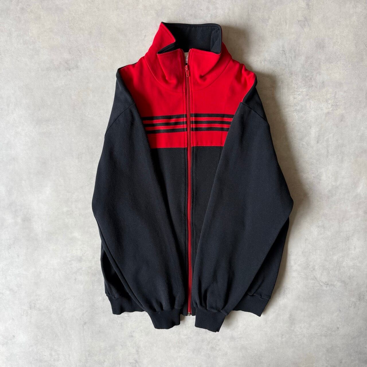 胸元にはトレフォイルの刺繍ロゴ、フロントには大胆な3本ラインが横に走るデザイン。ジップはレッドカラーのフルジップ仕様で、当時のデサント社によるしっかりとした作りが特徴です。