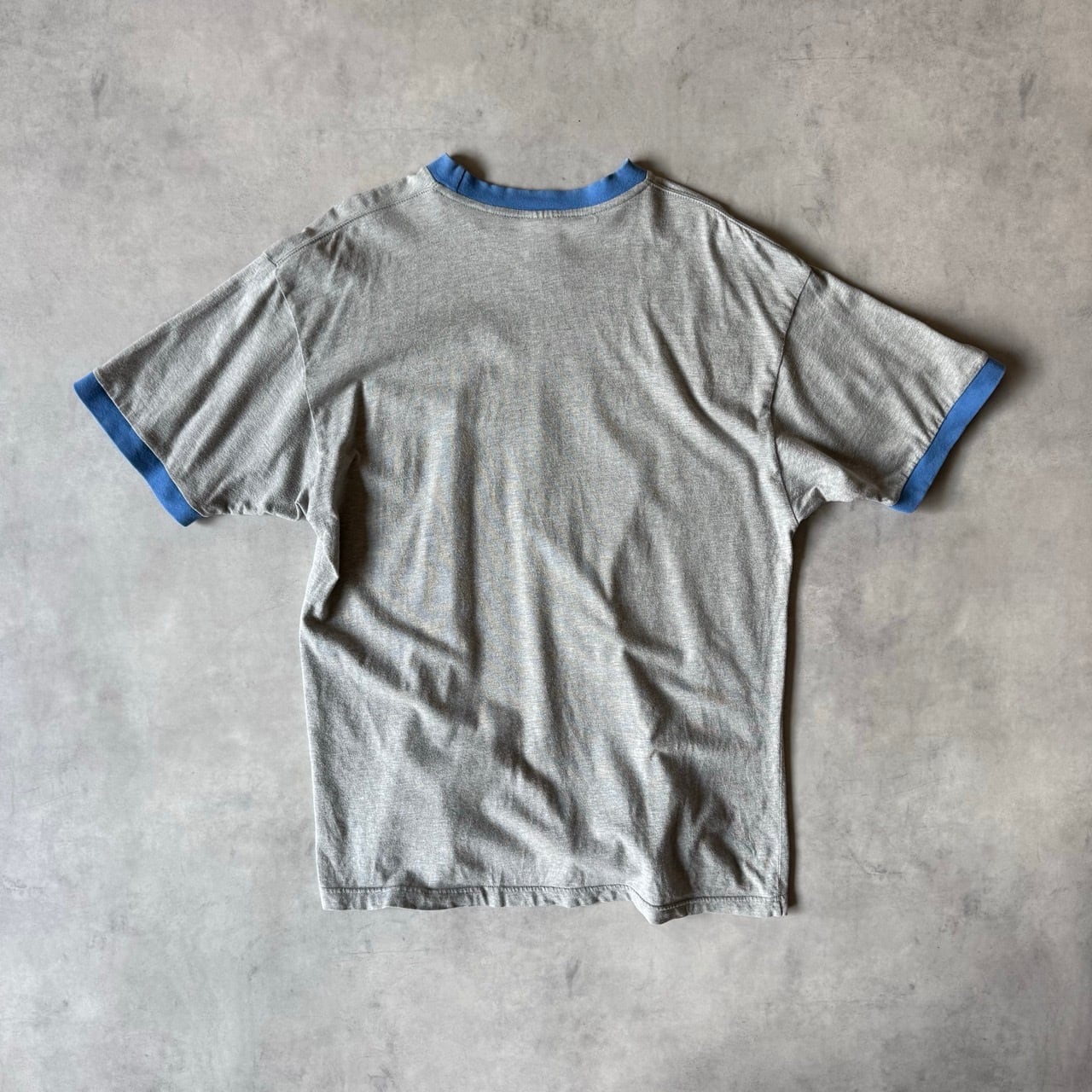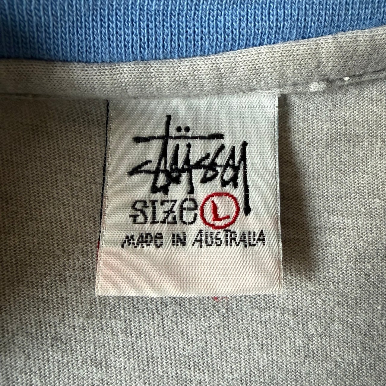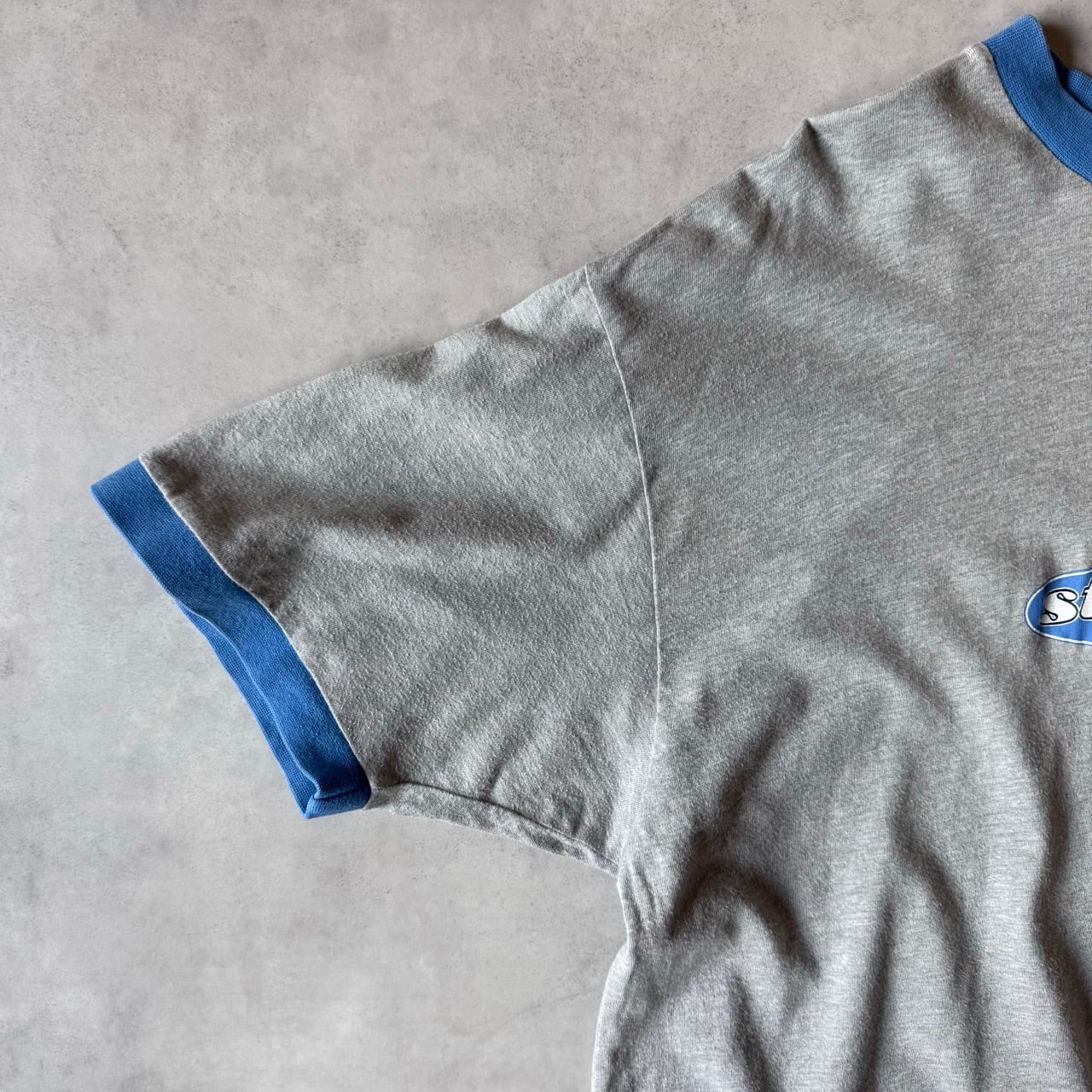 首元と袖口のブルーのリブがアクセントになったリンガー仕様。90年代頃のアイテムに見られる独特のフォントや配色が、現行品にはないオールドステューシーらしい雰囲気を放っています。