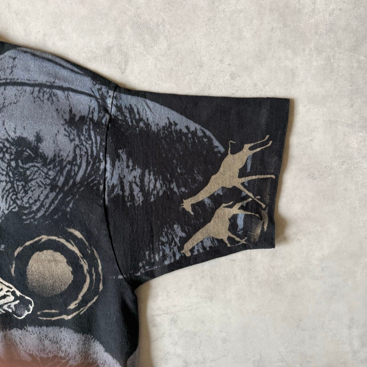 ・1990年代頃の希少なヴィンテージTシャツ。ボディ全体にシマウマ、チーター、ゾウ、キリンなどの野生動物が描かれた、迫力のある「All Over Print(大判プリント / 総柄)」仕様です。裾・袖ともにシングルステッチ。コピーライト入り。