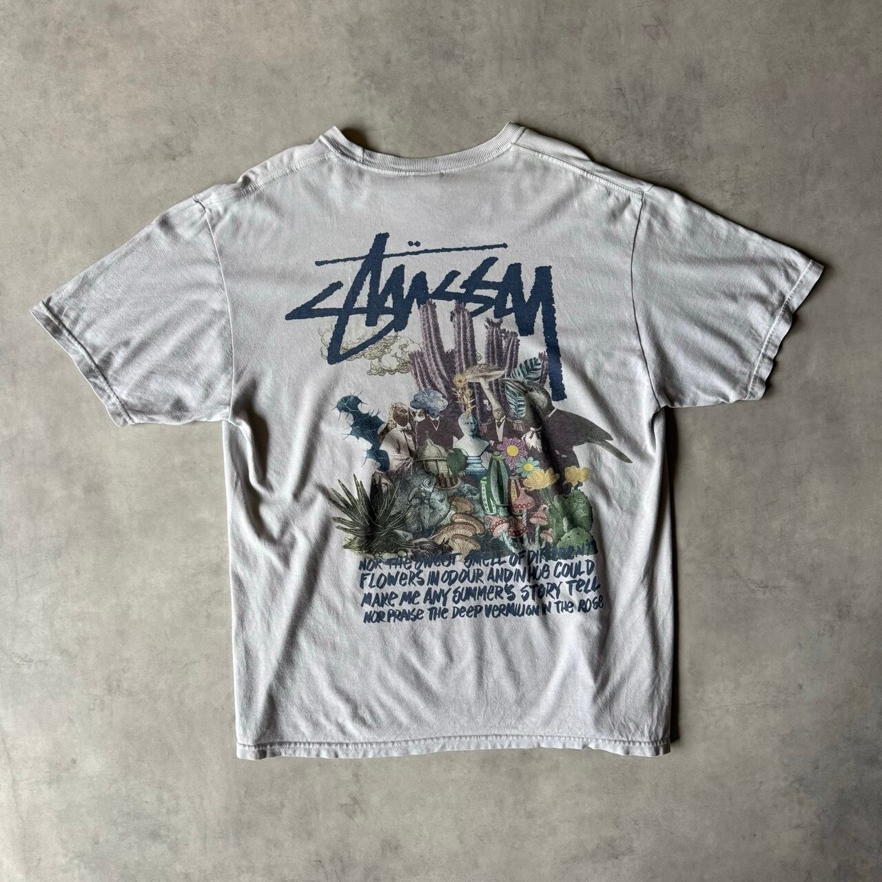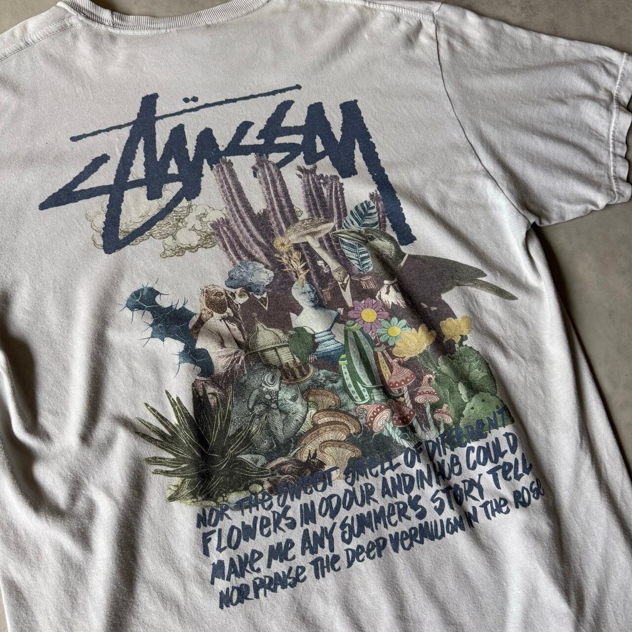 フロントは胸元にワンポイント、バックにはショーンフォントロゴと共にサボテンやカラス、石像などがコラージュされた大判のアートグラフィックが施された一着。
