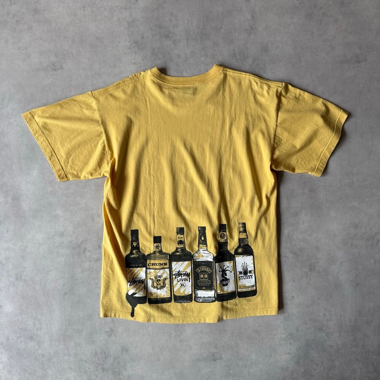 裾部分に酒瓶をモチーフにした独創的なグラフィックが、フロントからバックにかけて一周プリントされた贅沢なデザインです。