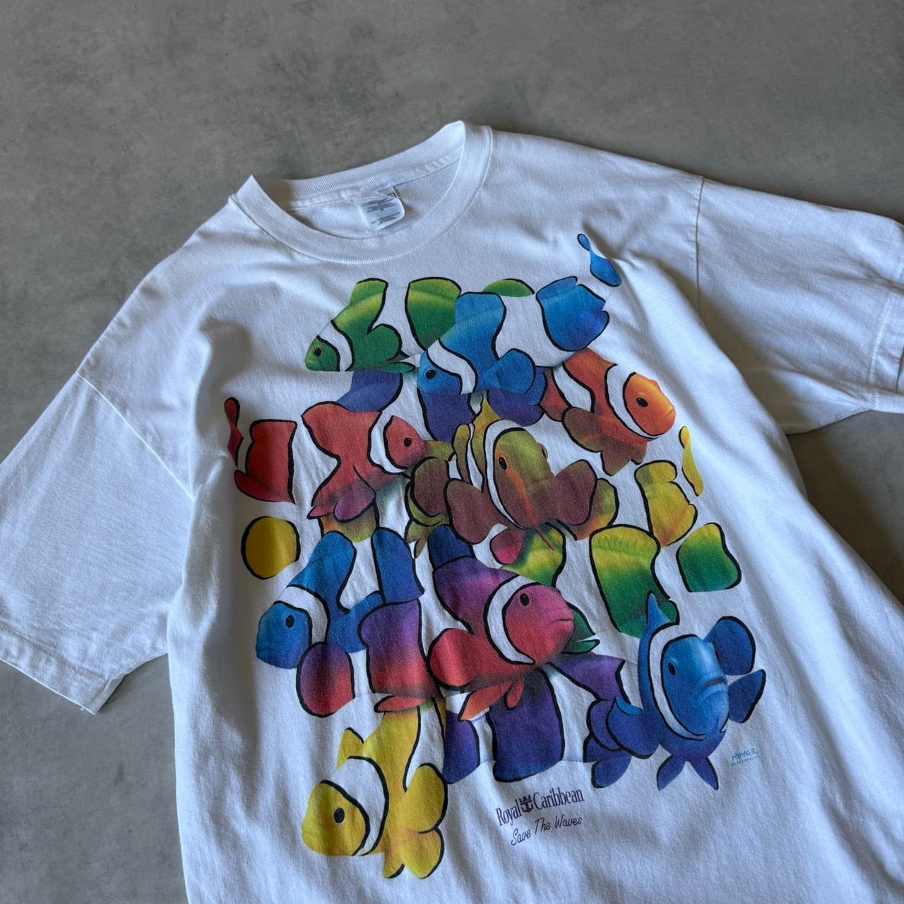 フロントには、「Royal Caribbean Save The Waves」のテキストと共に、色とりどりのカラフルな魚たちが大判でプリントされており、インパクトのある一着となっています。