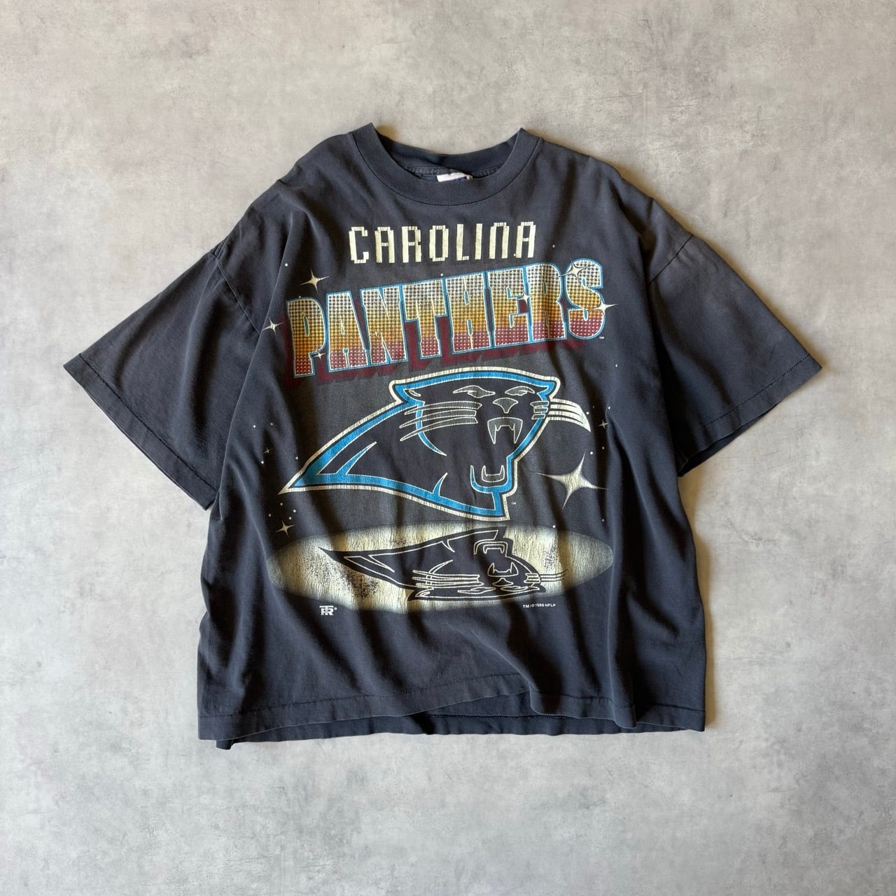 人気のアメフト(NFL)チーム「カロライナ・パンサーズ」のグラフィックが大胆にプリントされており、ヴィンテージならではのフェード感(色落ち)が非常に良い雰囲気を出しています。